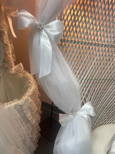 Planning a Bridal Shower or Baby Shower? We are your one-stop-shop not only for invitations, but also for your Wicker Chair, Wishing Well, Umbrella and Bridal Centerpiece Rental! These decorative pieces will help create great memory-making and fabulous photo ops! They are available as shown in all white ribbon/lace with pearl button detail. Coordinating items available. Rent ala carte or as part of a discounted rental package.